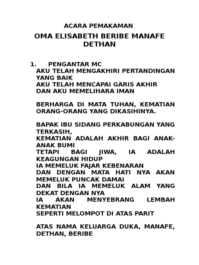 Bagi banyak orang kematian adalah sesuatu yang menakutkan dan karena itu segala usaha dan upaya . Contoh salam pembuka dan susunan acara. Untuk memudahkan mc dalam memandu jalannya upacara pelepasan jenazah ini,. Suatu ketika saya menghadiri prosesi pemakaman seorang kerabat. Contoh kata sambutan acara pemakaman.